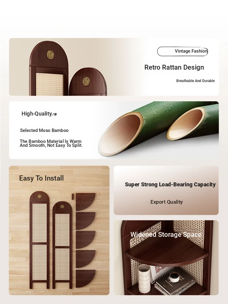 Corner Bookshelf and Floor Storage Rack - Wall-Mounted Triangular Narrow Cabinet for Easy Organization, Vintage Rattan Corner Storage Unit