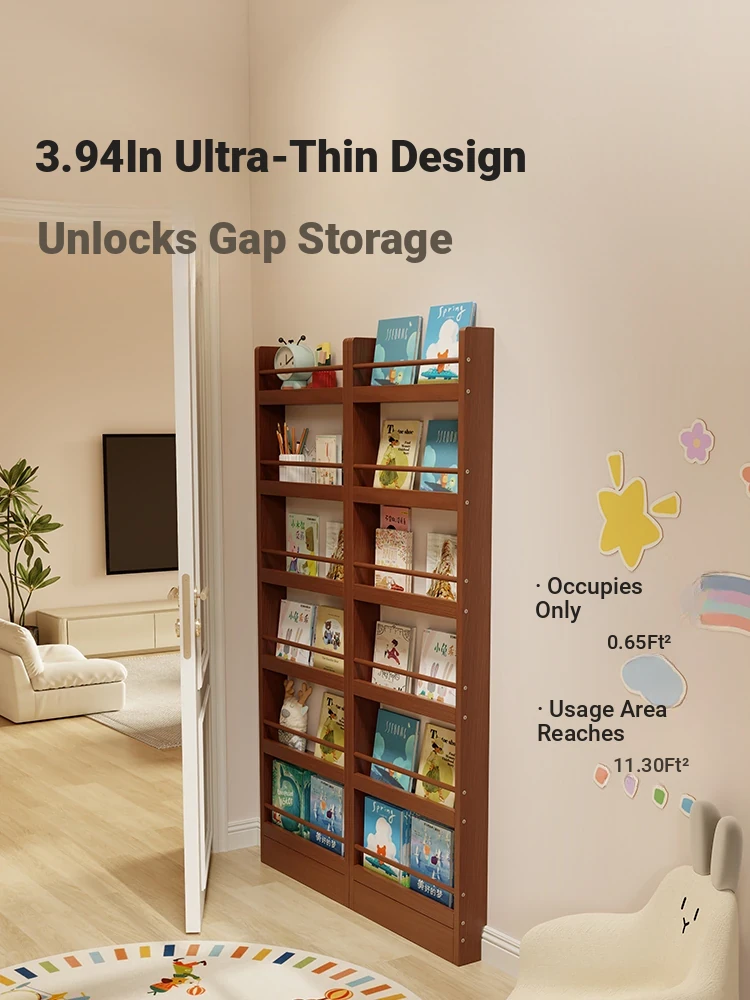 Slim Wall-Mounted Children's Bookshelf - Space-Saving Vertical Storage for Picture Books and Toys, Floor Stand Organizer, Perfect for Small Spaces and Doorway Storage Solutions