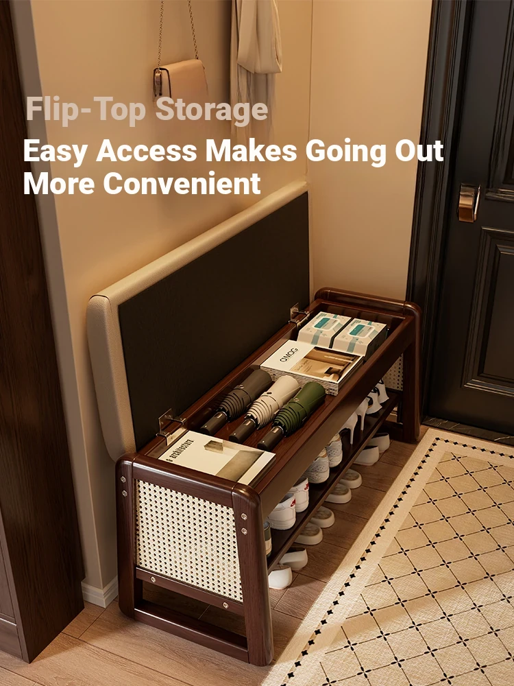 Designer Rattan Narrow Shoe Rack for Entryway – Solid Wood Entryway Bench with Storage, Perfect for Sitting and Organizing Shoes at Home.