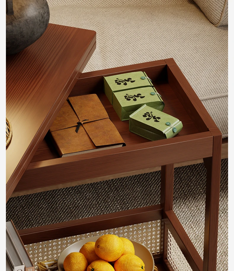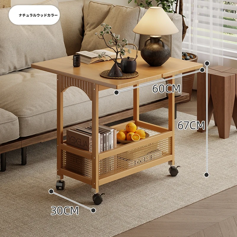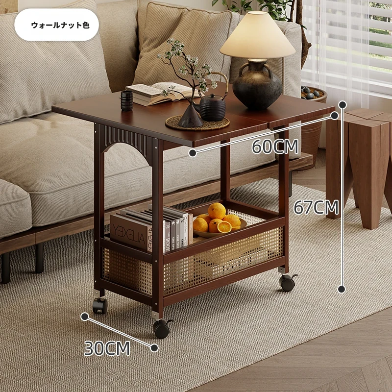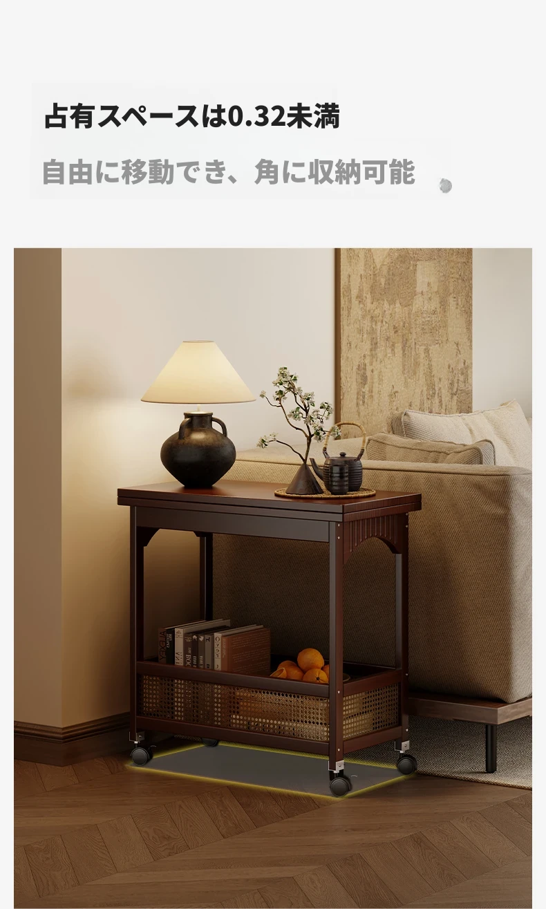 移動できる小型サイドテーブル!リビングにぴったりの収納付きキャスター付きラック - 高品質な無垢材使用で、ソファの横に最適な便利アイテム!おしゃれで機能的な空間を演出します。