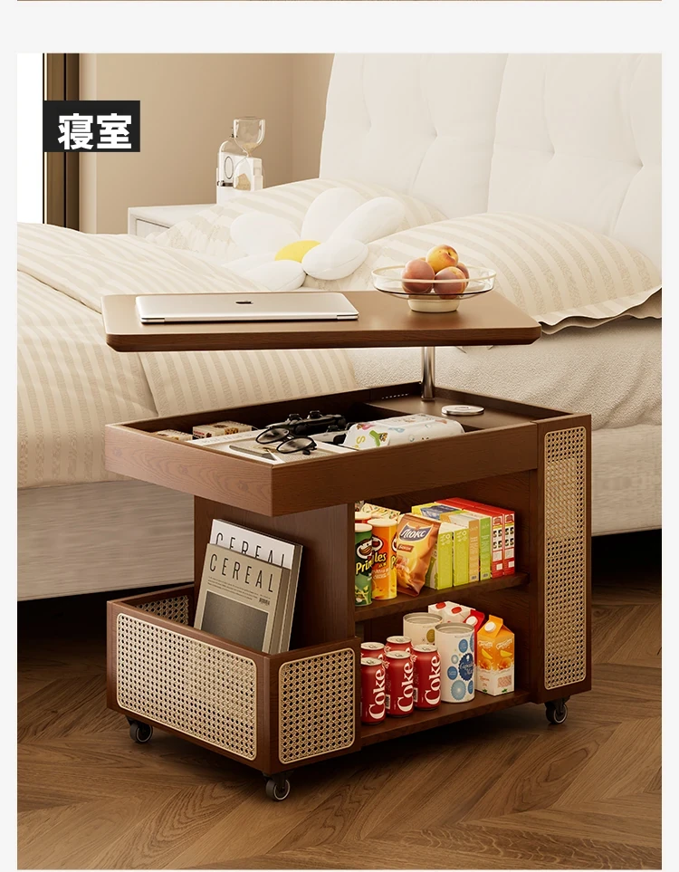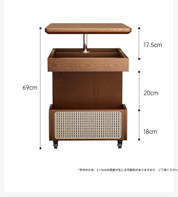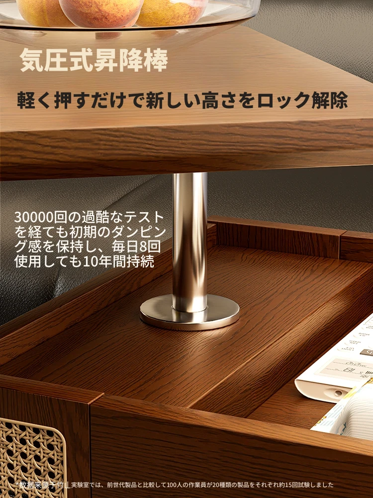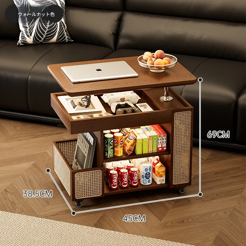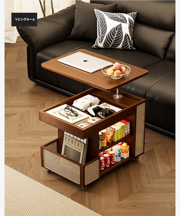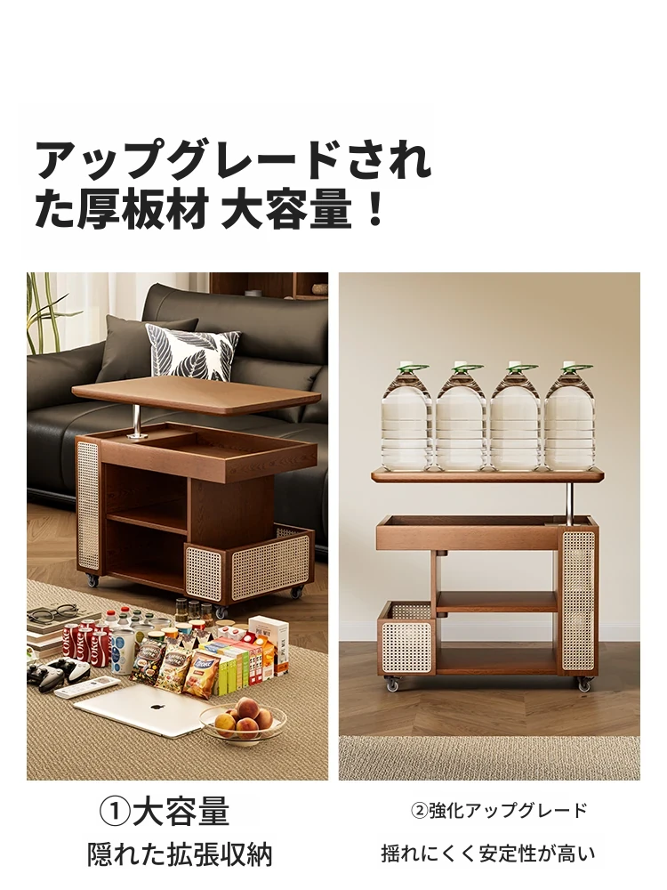 昇降式実木製移動式ティーテーブル - 小型住宅にぴったりのリビングルーム用サイドキャビネット・ソファサイドテーブル・コンパクトなバスサイドテーブル。魅力的なデザインで、スペースを有効活用!