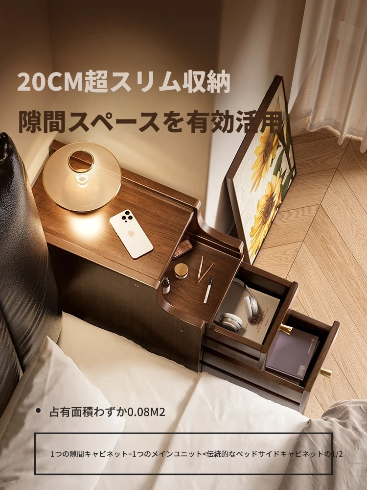 スリムな無垢材ベッドサイドキャビネット - 高級感あふれるミニ収納、狭いスペースにもぴったり!20cmの隙間にフィットするデザインで、小さな部屋でもスタイリッシュに収納力をアップ!