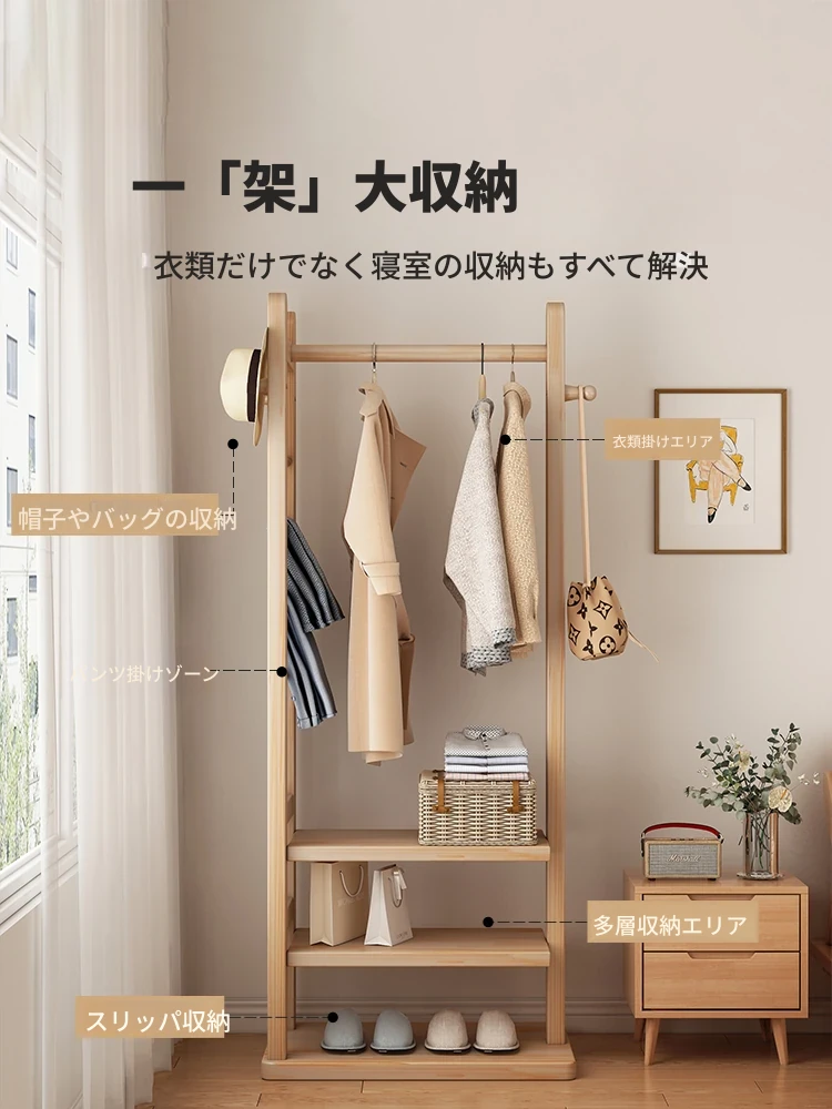 全実木製のスタンド式コートハンガー!寝室のベッドサイドにぴったり、秋冬の厚手衣類も楽々収納。角にフィットしてスペースを有効活用、オシャレで機能的な衣類の救世主です!