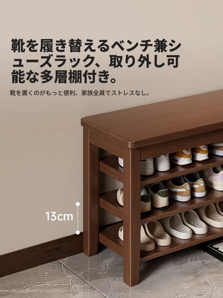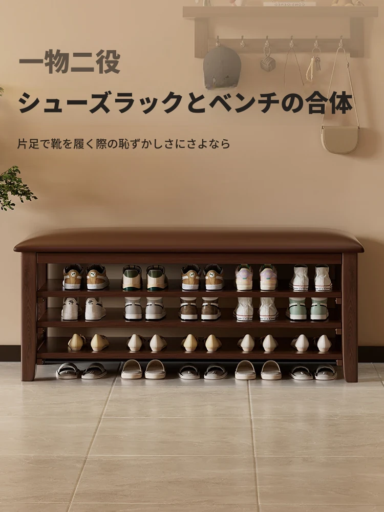 スリムな靴を履くためのベンチ - 高級感溢れる無垢材使用、玄関や入口に最適なコンパクトなシューズキャビネット兼用。おしゃれで実用的、来客時にも大活躍!
