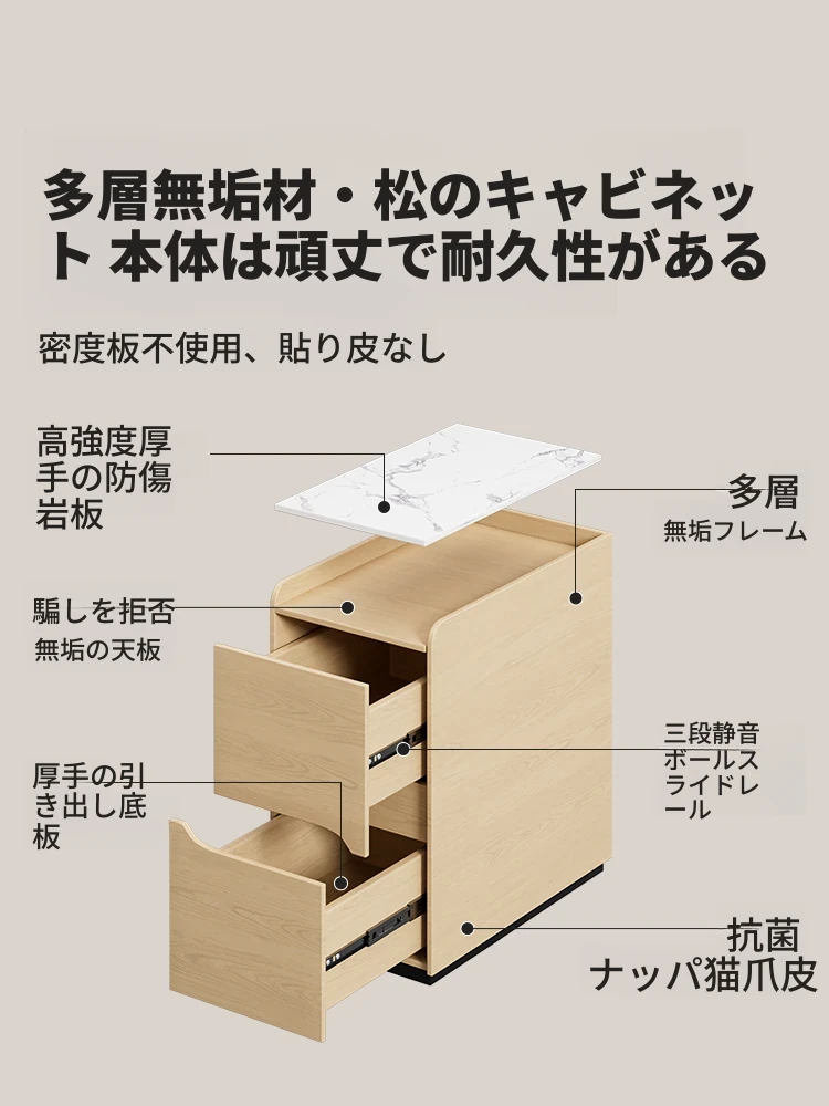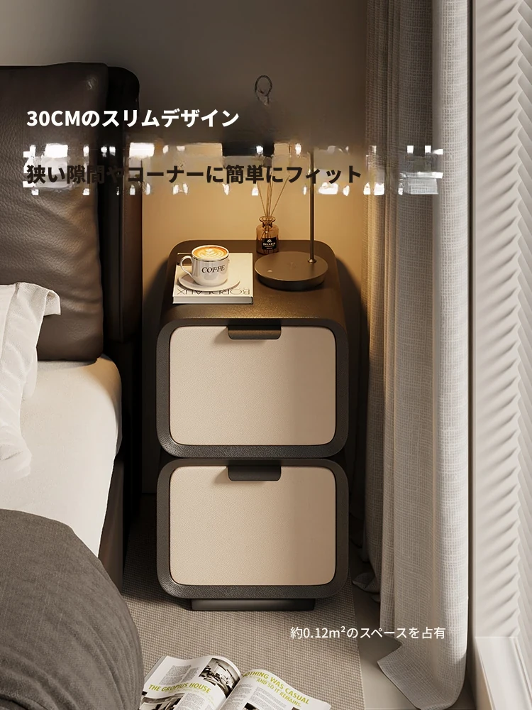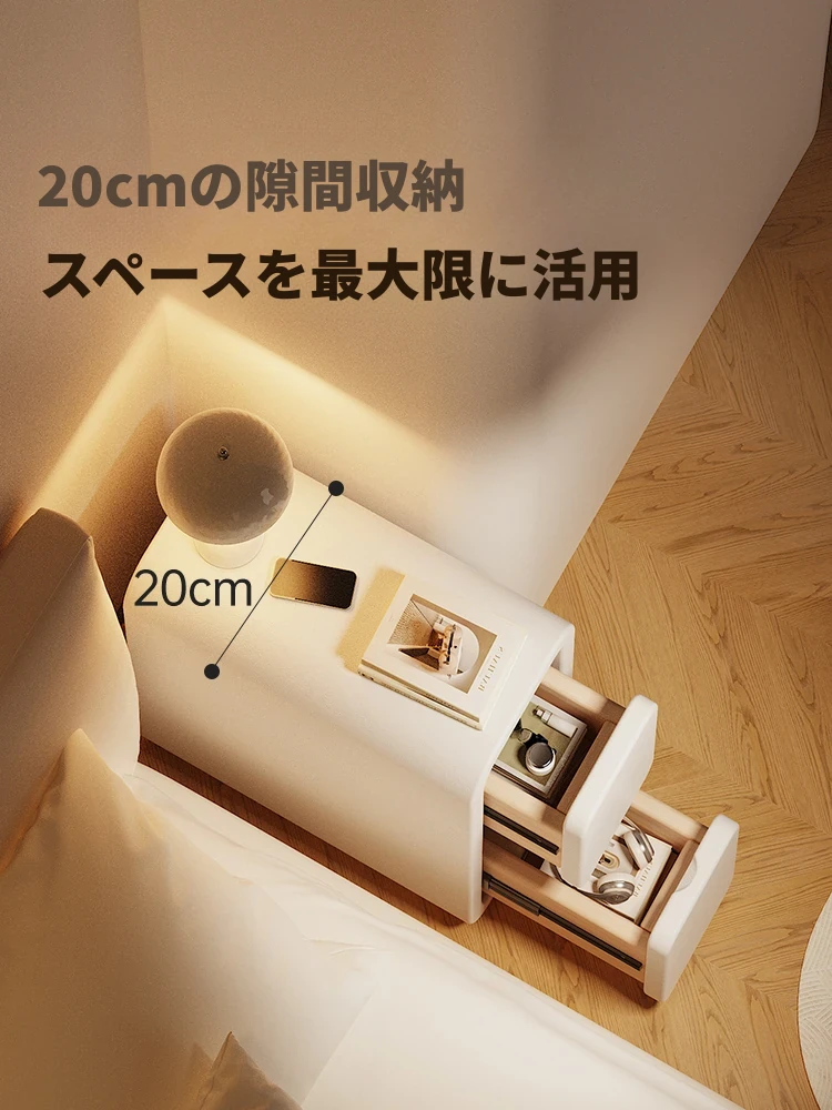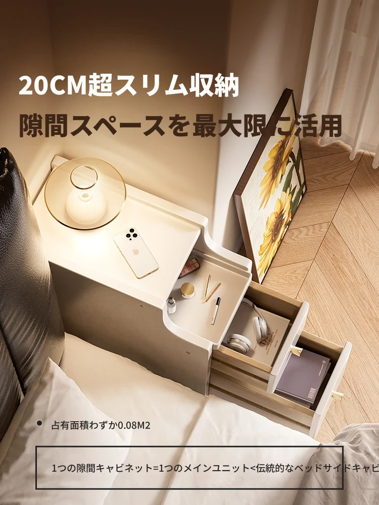 2024年新款!極薄デザインの天然木製ナイトテーブル - 20CMの省スペースで、シンプルでモダンなクリーム風のベッドサイドキャビネット。狭い隙間にもぴったりフィット!おしゃれで機能的な収納を実現!