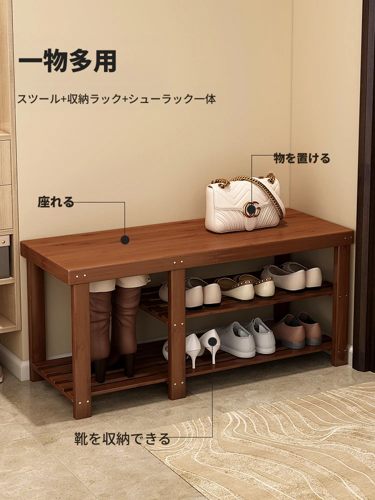 多層収納が可能!入居時に便利な厚手のバンブーシューズラック - 家庭用玄関に最適、座れるデザインで使いやすさ抜群!