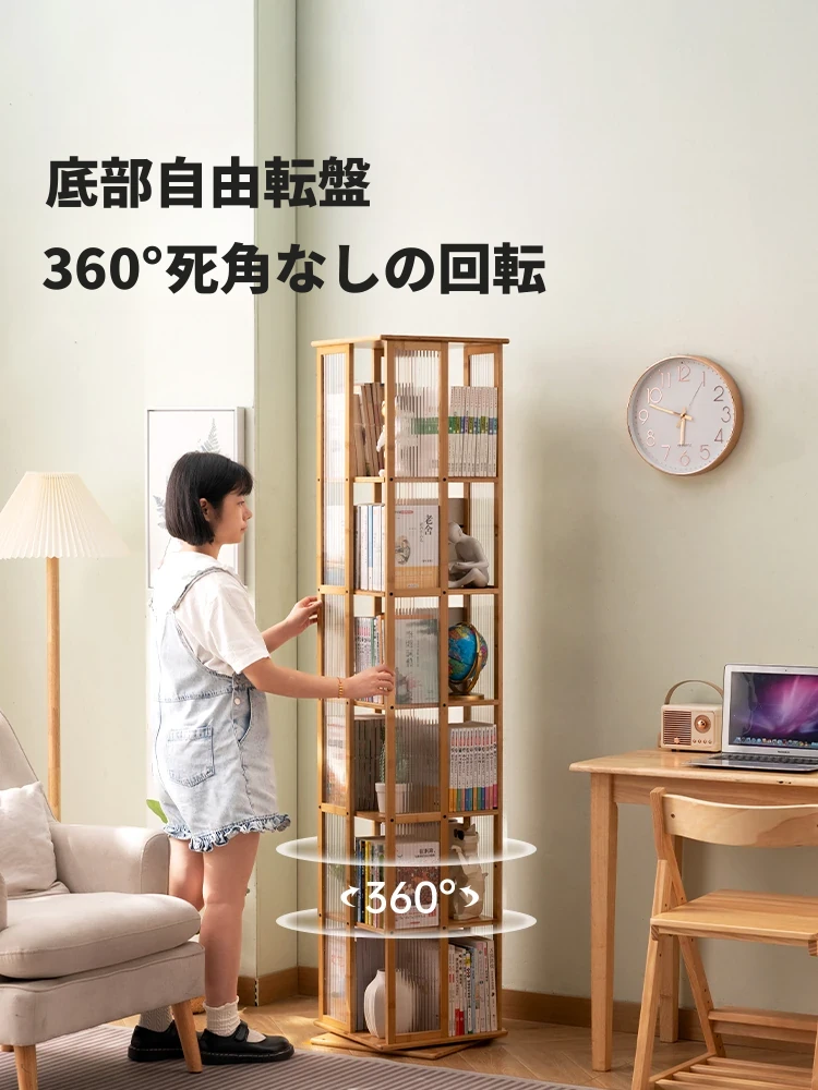360度回転書棚|家用フロアタイプ|簡単組立|子供向け移動式書棚|リビングにぴったりな天然木製収納ラック!本やおもちゃをすっきり整理!