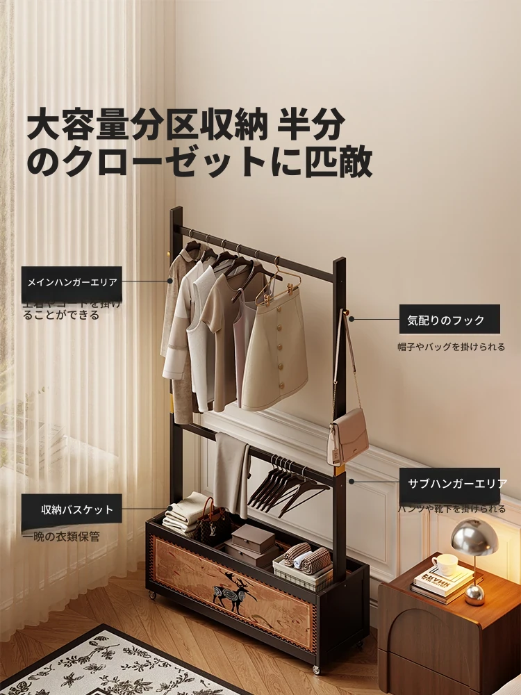 角に置ける衣類&小物収納マジック!ベッドサイドで便利な衣服・バッグ・靴・帽子をスッキリ整理する楠竹製ハンガーラック。キャスター付きで移動も簡単!おしゃれで機能的な収納アイテム。