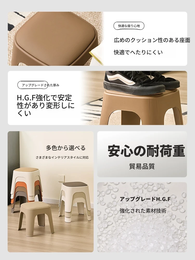厚手仕様のプラスチック製ミニスツール - リビングにぴったりの頑丈で耐久性抜群!柔らかいクッション付き、子供向けの四角いスツールはスタッキング可能で、家庭での使用に最適です。
